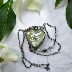 The pendant holds a single small rosebud, preserved in the natural shape and color, then carefully set in a glass in a stained glass technique. It will last a lifetime for you to admire!