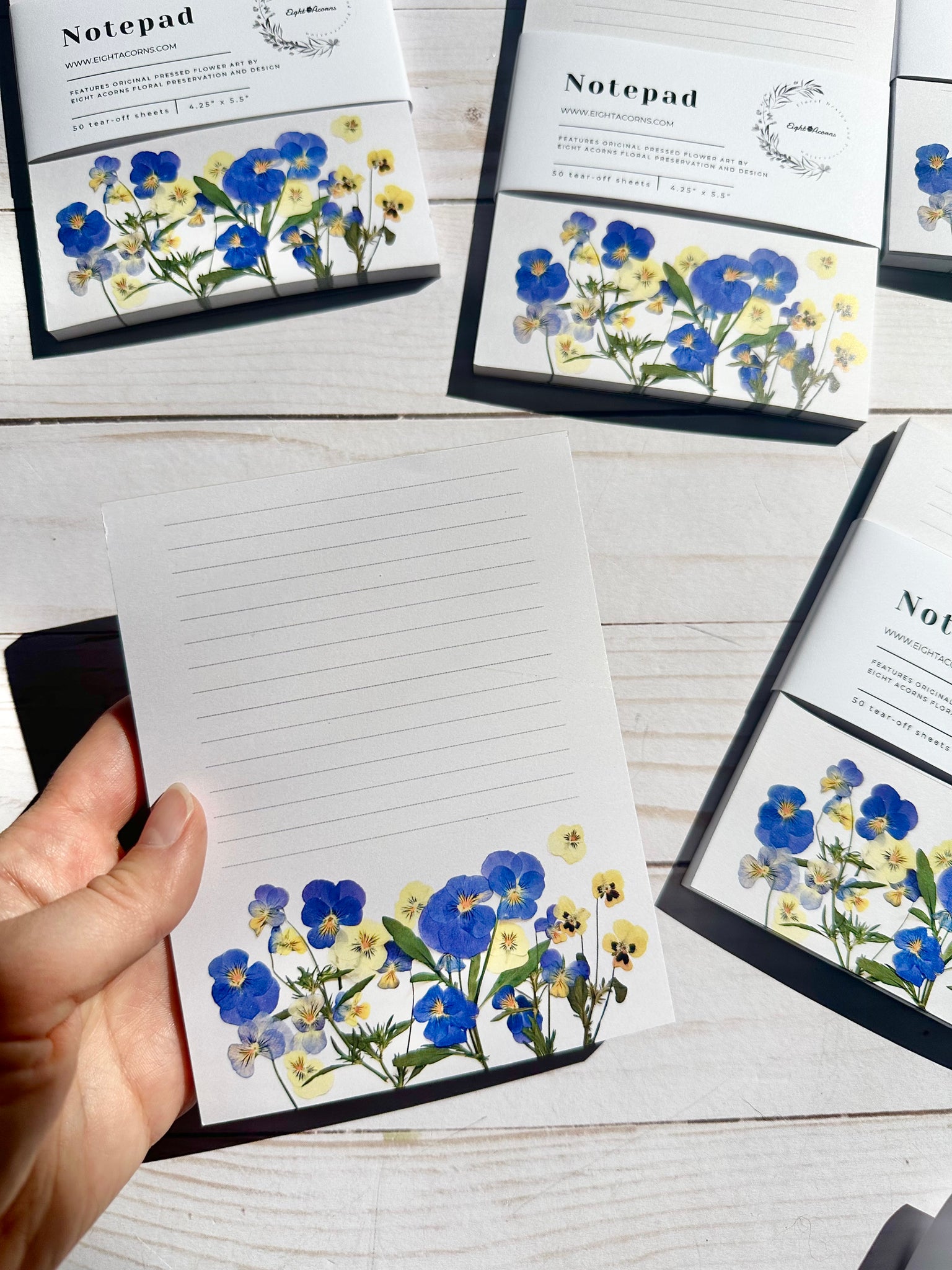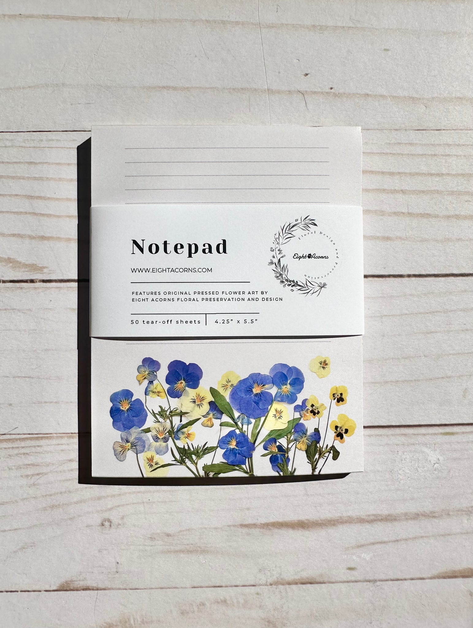 • Each notepad showcases a high-resolution photograph of pressed flowers, printed on heavyweight cardstock with a sturdy backboard.
