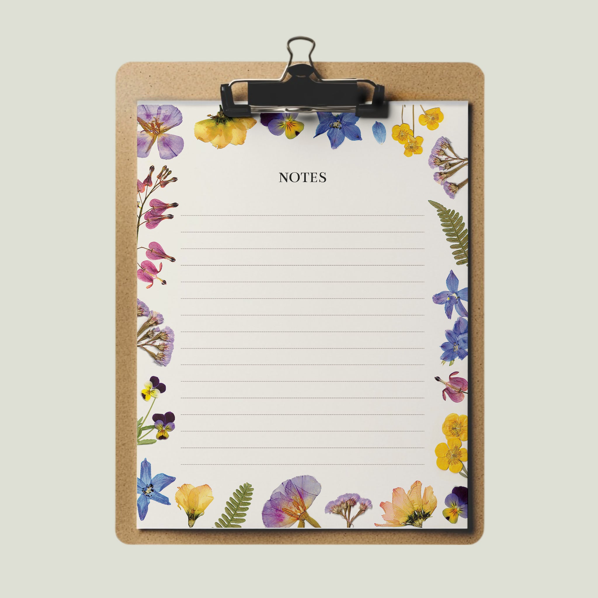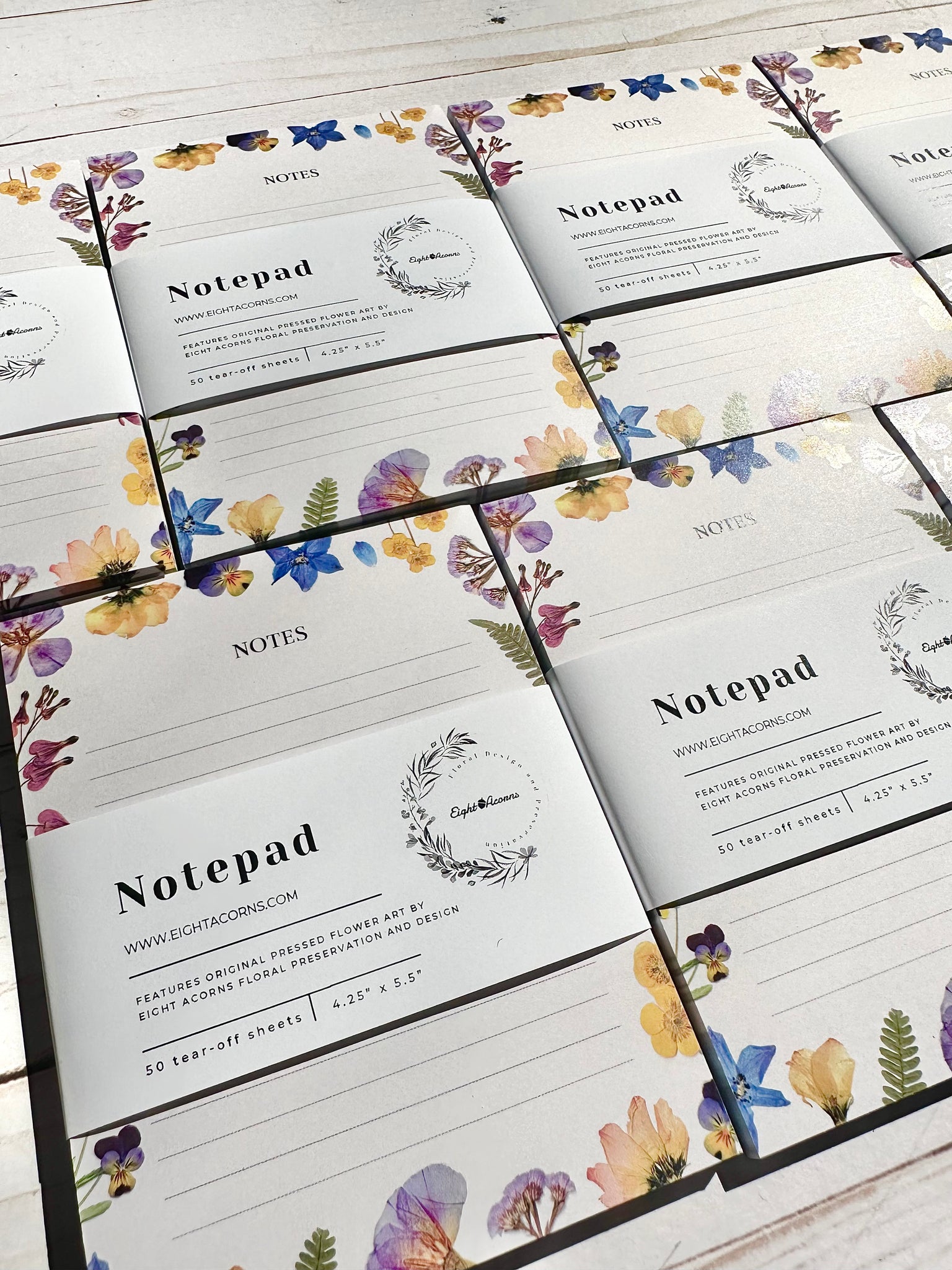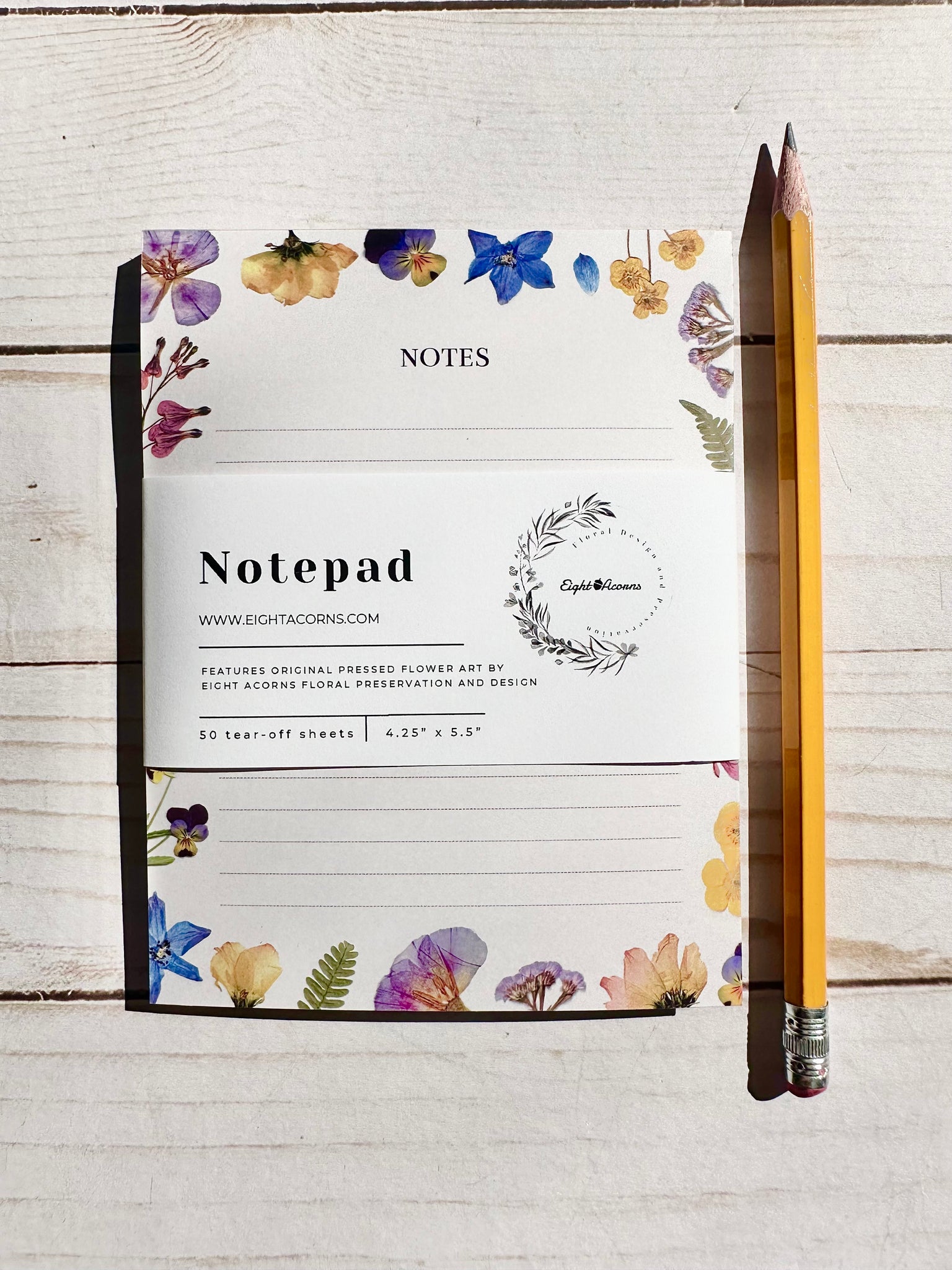 - Each notepad showcases a high-resolution photograph of pressed flowers, printed on heavyweight cardstock with a sturdy backboard.